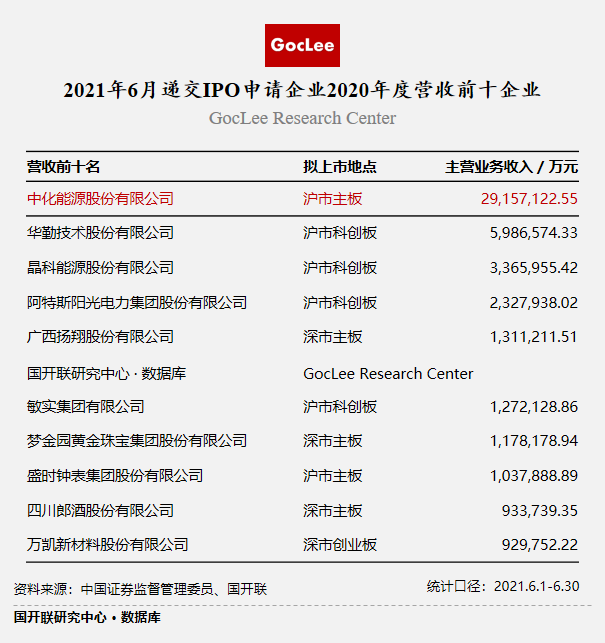 2021年6月遞交申請IPO的企業(yè)中,有7家企業(yè)2020年主營業(yè)務(wù)突破百億,其中4家企業(yè)擬上市地為滬市科創(chuàng)板,其余均為深市主板。值得關(guān)注的是,中化能源股份有限公司為6月遞交申請IPO中唯一2020年主營業(yè)務(wù)收入突破千億元的企業(yè)。