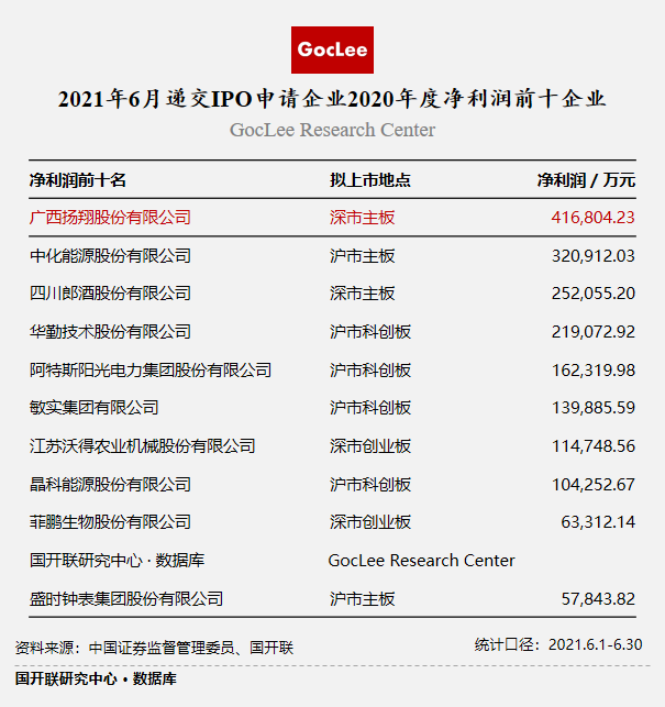 從凈利潤來看,6月遞交申請IPO企業(yè)中,有8家企業(yè)凈利潤突破10億元,其中廣西揚(yáng)翔股份有限公司凈利潤為416,804.23萬元,凈利潤收入位居首位。
