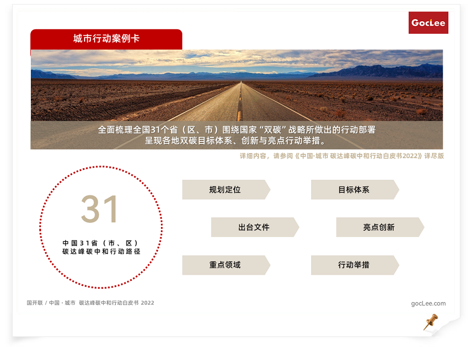 同時,國開聯(lián)可持續(xù)發(fā)展團(tuán)隊(duì)也整理和提煉了31?。▍^(qū)、市)在碳達(dá)峰碳中和領(lǐng)域的具體行動策略,重點(diǎn)針對其目標(biāo)設(shè)定、定位規(guī)劃、出臺文件和政策措施亮點(diǎn),形成31?。▍^(qū)、市)的行動案例卡,以幫助碳達(dá)峰碳中和相關(guān)參與者更好地了解符合我國國情的雙碳路線。