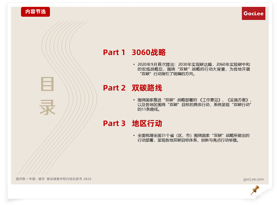 《白皮書》主要分為三部分,第一,“3060”戰(zhàn)略背景,國家提出“3060”戰(zhàn)略目標(biāo),為各地開展“雙碳”行動指引了明確的方向;第二,雙碳路線,根據(jù)國家頂層設(shè)計,系統(tǒng)梳理“雙碳行動”的11條路線及對比不同省(區(qū)、市)的差異性做法;第三,地區(qū)行動,全面梳理31個省(區(qū)、市)圍繞國家“雙碳”戰(zhàn)略所做出的行動部署,呈現(xiàn)各地雙碳目標(biāo)體系、創(chuàng)新與亮點(diǎn)行動舉措。