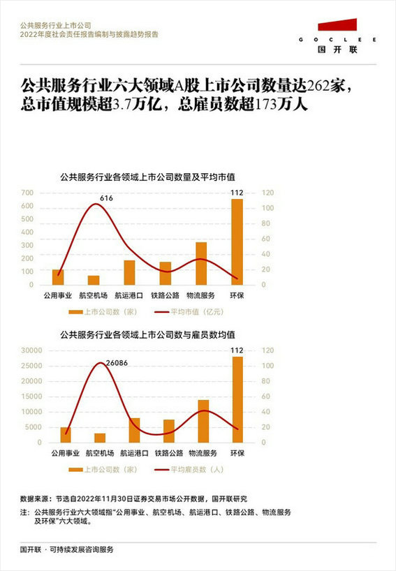 國開聯(lián)《公共服務(wù)行業(yè)2022年度社會(huì)責(zé)任報(bào)告編制與披露趨勢(shì)報(bào)告》顯示,公共服務(wù)行業(yè)六大領(lǐng)域A股上市公司數(shù)量超過260家,總市值規(guī)模超3.7萬億,總雇員數(shù)超173萬人。