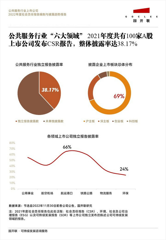 國開聯(lián)《公共服務(wù)行業(yè)2022年度社會(huì)責(zé)任報(bào)告編制與披露趨勢(shì)報(bào)告》指出,公共服務(wù)行業(yè)“六大領(lǐng)域”2021年度共有100家A股上市公司獨(dú)立發(fā)布了社會(huì)責(zé)任報(bào)告(CSR)、ESG報(bào)告和可持續(xù)發(fā)展報(bào)告(SDR),整體披露率達(dá)38.17%。