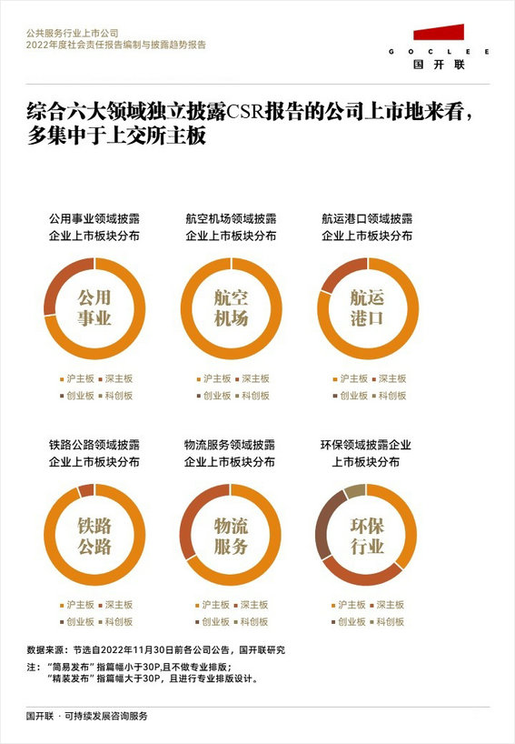根據(jù)國開聯(lián)《公共服務(wù)行業(yè)2022年度社會(huì)責(zé)任報(bào)告編制與披露趨勢(shì)報(bào)告》數(shù)據(jù)顯示,公共服務(wù)行業(yè)六大領(lǐng)域獨(dú)立披露社會(huì)責(zé)任報(bào)告(含CSR、ESG、SDR)的公司上市地,多集中于上交所主板。