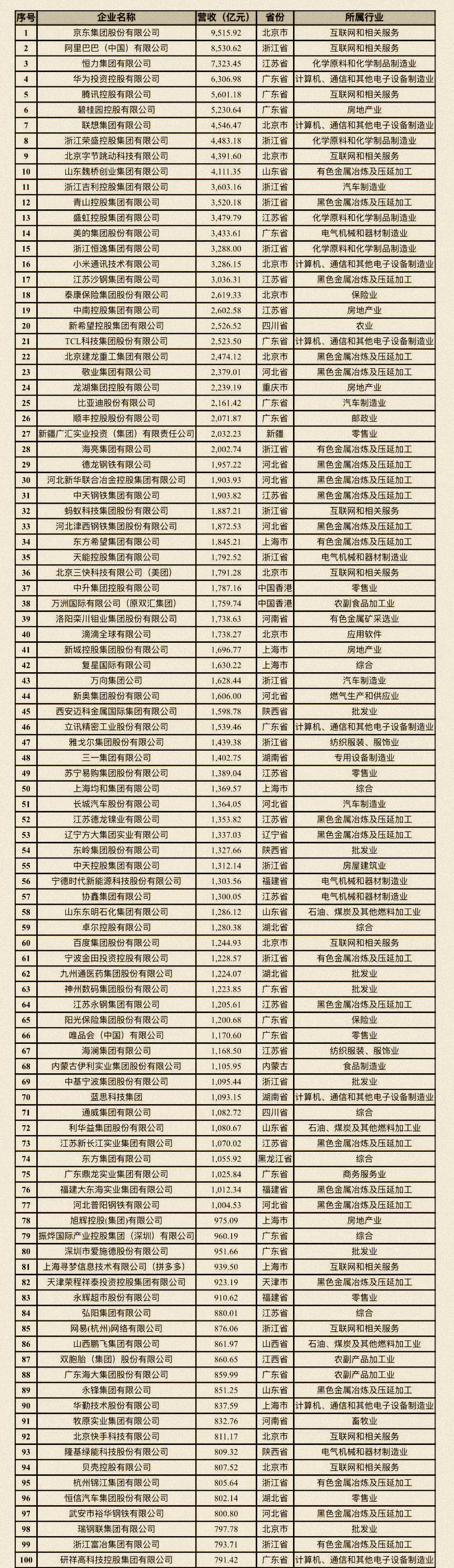 前十強(qiáng)民營企業(yè)入圍門檻約為4100億元,以互聯(lián)網(wǎng)、先進(jìn)制造為代表。其中以京東、阿里巴巴、騰訊、字節(jié)跳動(dòng)為代表的互聯(lián)網(wǎng)企業(yè)占據(jù)4席,京東商業(yè)模式以自營為主,其銷售額大部分計(jì)為收入,以9515.9億元的營收位居第一,2022年?duì)I收破萬億。以恒力集團(tuán)、榮盛為代表的化學(xué)原料和化學(xué)制品制造業(yè)占據(jù)2席。以華為、聯(lián)想為代表的計(jì)算機(jī)、通信、電子設(shè)備先進(jìn)制造業(yè)占據(jù)2席,以碧桂園為代表的房企占據(jù)1席,以山東魏橋?yàn)榇淼挠猩饘僖睙捈皦貉蛹庸I(yè)占據(jù)1席。
