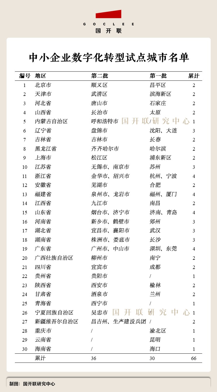 根據國開聯(lián)數字經濟研究團隊統(tǒng)計,2023年8月份工業(yè)和信息化部中小企業(yè)局、財政部經濟建設司發(fā)布“第二批中小企業(yè)數字化轉型試點城市”公示名單,確定首批30個城市被納入試點范圍;此次發(fā)布的公示名單顯示,36個城市被納入試點范圍。如無特殊變化,累計將有66座城市被納入“中小企業(yè)數字化轉型試點范圍”。
