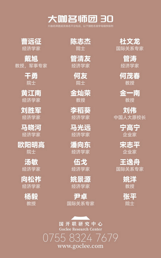 國開聯(lián)首批30人“大咖名師團(tuán)”成員涵蓋:宏觀戰(zhàn)略、經(jīng)濟(jì)發(fā)展、商業(yè)運(yùn)行、國際關(guān)系等領(lǐng)域,分別來自頂尖學(xué)府、知名研究機(jī)構(gòu)和企業(yè)機(jī)構(gòu),他們是:代表著學(xué)術(shù)塔尖的院士級專家、富有廣泛影響力的教授、著名經(jīng)濟(jì)學(xué)家和廣受贊譽(yù)的商界領(lǐng)袖等。致力于傳遞最前沿的思想,以幫助大家更加清晰的“看見未來”。
