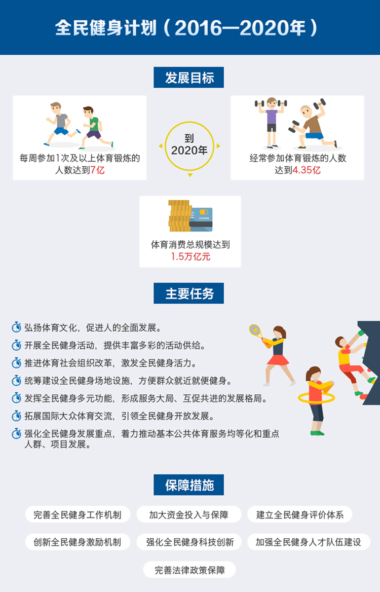 “健康中國”與“全民健身”首次對接“黨的十八屆五中全會提出推進建設健康中國的目標,前不久發(fā)布的‘十三五’國民經(jīng)濟和社會發(fā)展規(guī)劃綱要,從醫(yī)、衛(wèi)、體、食、藥等8個方面對推進健康中國提出要求,‘廣泛開展全民健身運動’位列其中?!眹殷w育總局局長助理李穎川表示,《計劃》將全民健身定位于“健康中國建設的有力支撐”,意味著在“十三五”國家發(fā)展總體布局中,“健康中國”與“全民健身”首次對接。