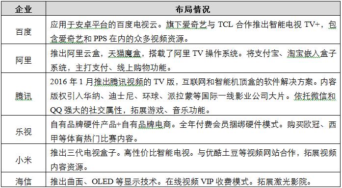目前,智能電視領(lǐng)域主要的參與者有百度、阿里、騰訊、樂視、小米以及海信等企業(yè)。