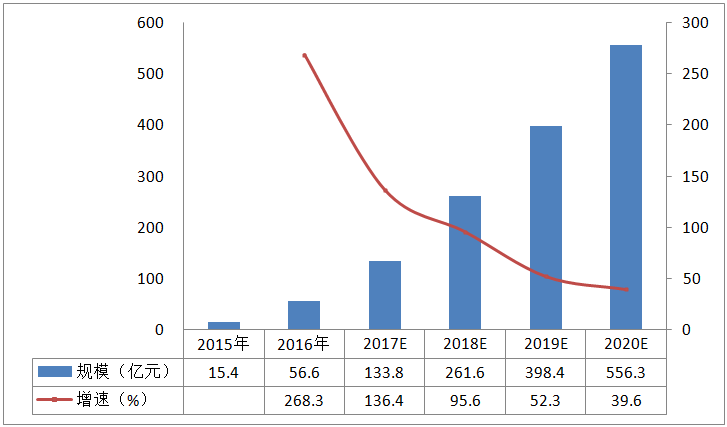 2015年中國虛擬現(xiàn)實(shí)行業(yè)市場規(guī)模為15.4億元, 2016年達(dá)到56.6億元,2020年市場規(guī)模預(yù)計(jì)將超過550億元。