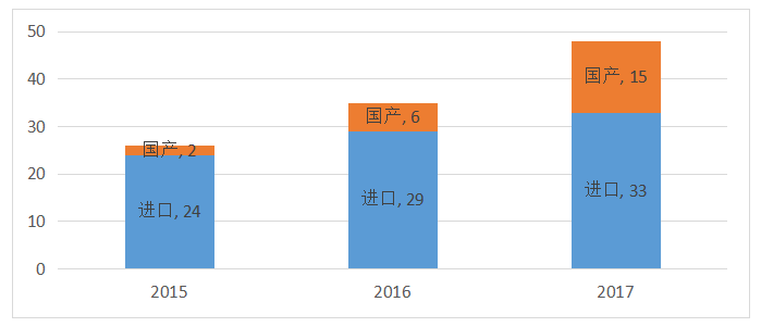 在架空索道方面,近三年來脫掛式架空索道中進(jìn)口和國產(chǎn)數(shù)量關(guān)系,國產(chǎn)脫掛式架空索道的發(fā)展較快,從2015年的2條增長到2017年的15條。2015-2017年進(jìn)口占比分別是99.3%、83%、79%。雖然在穩(wěn)步降低,但是進(jìn)口依賴度總體較高,將近80%。