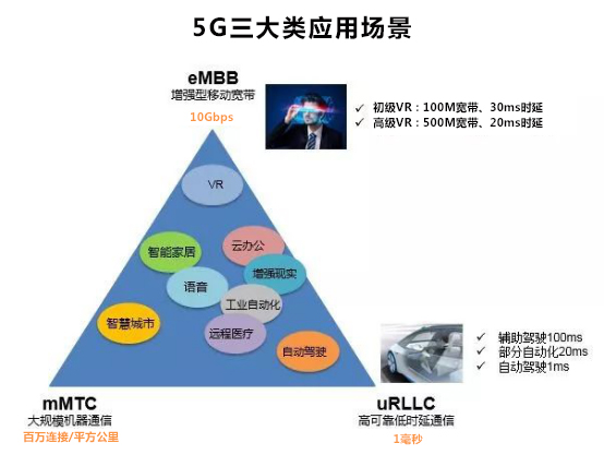2、高可靠低時延連接(uRLLC):應(yīng)用主要有無人駕駛、公共和大眾交通系統(tǒng)、無人駕駛飛行器、工業(yè)自動化、遠(yuǎn)程醫(yī)療以及智能電網(wǎng)監(jiān)控等。