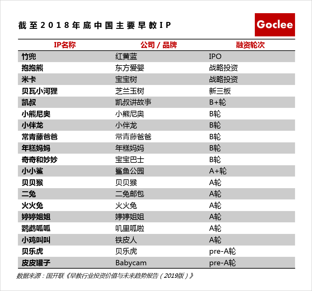 IP在文娛、旅游等領(lǐng)域的成功變現(xiàn),使得越來越多的教育機(jī)構(gòu)和創(chuàng)業(yè)公司以此為切入點(diǎn)探路早教發(fā)展新模式。根據(jù)國開聯(lián)《早教行業(yè)投資價值與未來趨勢報告(2019版)》統(tǒng)計,當(dāng)前市面上有超過20家早教企業(yè)已成功培育、孵化出屬于自己的早教IP。
