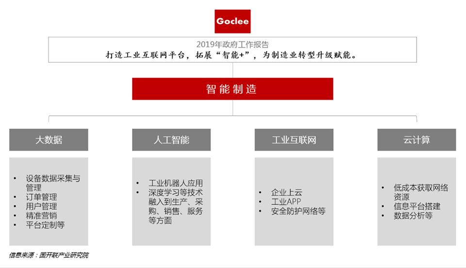 2019年政府工作報告中指出將圍繞推動制造業(yè)高質(zhì)量發(fā)展,強化工業(yè)基礎(chǔ)和技術(shù)創(chuàng)新能力,促進先進制造業(yè)和現(xiàn)代服務(wù)業(yè)融合發(fā)展,加快建設(shè)制造強國。打造工業(yè)互聯(lián)網(wǎng)平臺,拓展“智能+”,為制造業(yè)轉(zhuǎn)型升級賦能。由此,“智能+”開始接棒“互聯(lián)網(wǎng)+”,成為國家推動傳統(tǒng)制造業(yè)升級轉(zhuǎn)型的新抓手,未來將成為政策關(guān)注的重點。