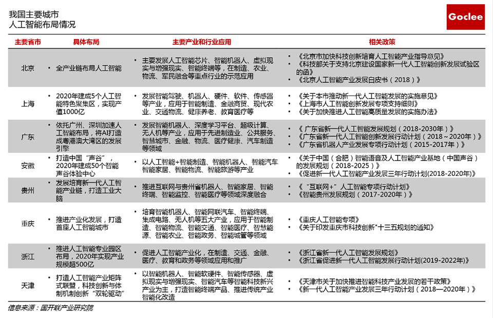 由于大數(shù)據(jù)、云計算等技術(shù)在制造業(yè)企業(yè)進行智能轉(zhuǎn)型中較早應(yīng)用,國內(nèi)大部分城市已經(jīng)開始對這兩項技術(shù)相關(guān)產(chǎn)業(yè)進行布局,幫助自身企業(yè)進行轉(zhuǎn)型。而對于人工智能、工業(yè)互聯(lián)網(wǎng)等人才基礎(chǔ)和產(chǎn)業(yè)水平要求較高的兩項技術(shù),國內(nèi)城市也開始逐步布局,北上廣深等一線城市依托龐大的人才基礎(chǔ)和產(chǎn)業(yè)優(yōu)勢率先布局,福建、貴州、天津、重慶等省市緊隨其后,通過相關(guān)平臺的搭建和技術(shù)水平的不斷提升,將人工智能和工業(yè)互聯(lián)網(wǎng)相關(guān)技術(shù)應(yīng)用在醫(yī)療、高端裝備、汽車、安防、傳感器、3D打印、通航、智慧城市等產(chǎn)業(yè)和領(lǐng)域。