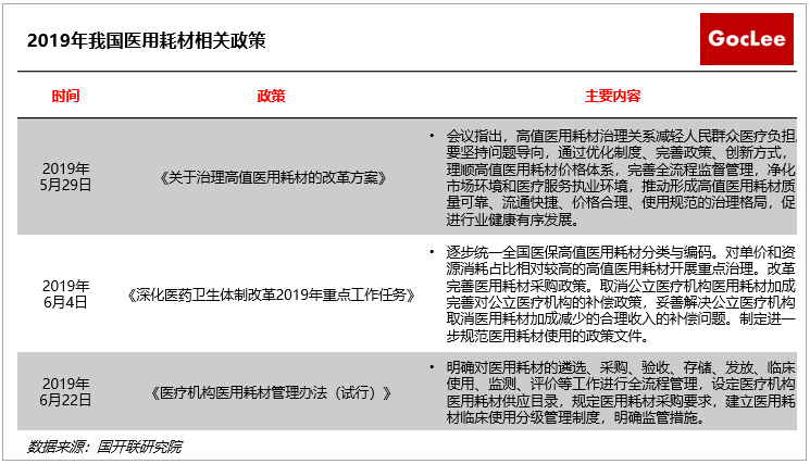 為整治上述問題,2019年5-6月國家陸續(xù)出臺《關于治理高值醫(yī)用耗材的改革方案》、《深化醫(yī)療衛(wèi)生體制改革2019年重點工作任務》和《醫(yī)療機構醫(yī)用耗材管理辦法(試行)》三項政策針對醫(yī)療耗材進行整治,主要通過藥品耗材聯(lián)合帶量采購、取消醫(yī)用耗材加成、降低檢查檢驗費用等綜合措施,進一步規(guī)范調整醫(yī)療服務項目價格,改善醫(yī)療服務。