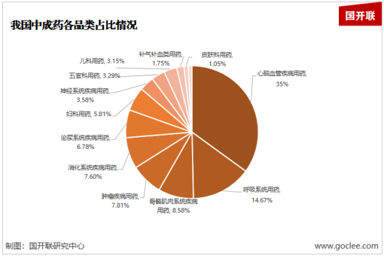中醫(yī)藥覆蓋品類眾多,主要分為13大類,中成藥在我國心腦血管、骨骼肌肉系統(tǒng)和疾病用藥、呼吸系統(tǒng)疾病、消化系統(tǒng)疾病和泌尿系統(tǒng)疾病等疾病治療領(lǐng)域扮演著重要的角色。其中心腦血管疾病用藥是我國中成藥市場的第一消費(fèi)大類,占據(jù)總體市場35%的市場份額,呼吸系統(tǒng)用藥和骨骼肌肉系統(tǒng)疾病用藥分別位居第二和第三位,不乏血栓通、丹參多酚酸鹽、丹參川穹嗪注射液、腦心通箭囊、復(fù)方丹參滴丸等多個優(yōu)秀產(chǎn)品。
