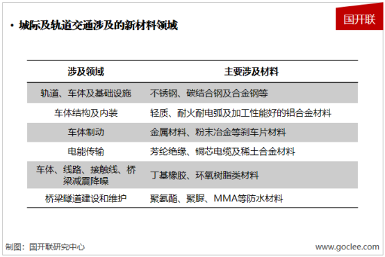 城際及軌道交通新材料涉及領(lǐng)域較多,覆蓋軌道及車體制造材料、車體結(jié)構(gòu)及內(nèi)裝材料、車體制動(dòng)材料、電能傳輸線路材料和車體運(yùn)行過程中相應(yīng)的減震防燥材料和維護(hù)的防水材料等領(lǐng)域。