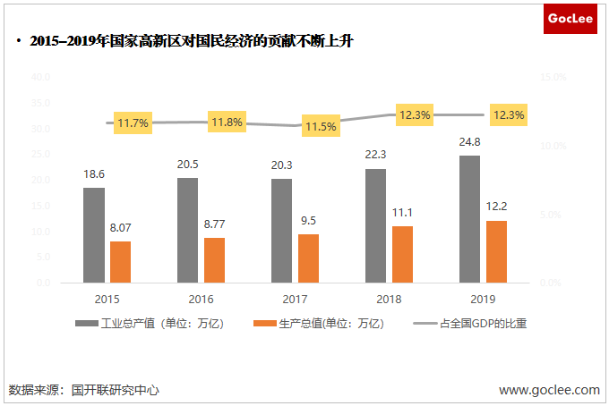 國家開發(fā)區(qū)自1988年啟動建設(shè)以來,已經(jīng)成為我國實(shí)施創(chuàng)新驅(qū)動戰(zhàn)略的主要載體,在轉(zhuǎn)變發(fā)展方式、優(yōu)化產(chǎn)業(yè)結(jié)構(gòu)、增強(qiáng)國際競爭力等方面發(fā)揮了重要作用。根據(jù)國家科學(xué)技術(shù)部,2019年全國169個國家高新區(qū)總體營收達(dá)38.3萬億元,工業(yè)增加值達(dá)24.8萬億元,園區(qū)生產(chǎn)總值達(dá)12.2萬億,相較2015年增長了51.2%,占我國GDP的比重從2015年的11.7%上升至2019年的12.3%,增長了0.6個百分點(diǎn),對我國國民經(jīng)濟(jì)的貢獻(xiàn)不斷上升。