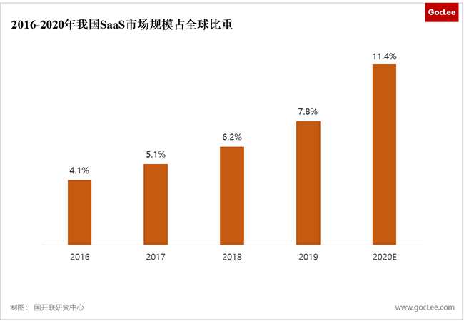 隨著中國企業(yè)信息化水平的不斷提升,企業(yè)對使用管理軟件和效率工具的認(rèn)知也將逐步深化。相比于傳統(tǒng)軟件,SaaS軟件具有部署靈活、迭代迅速、支持按需付費(fèi)等優(yōu)點(diǎn),使得其在軟件市場中的份額進(jìn)一步擴(kuò)張。2019年中國企業(yè)級SaaS的市場規(guī)模是362.1億元,占應(yīng)用軟件的比例為17.2%,相比于2014年的6.0%已有了成倍增長,此后隨著SaaS市場的迅速擴(kuò)張,這一占比將在2023年達(dá)到38.7%。2020年我國SaaS市場規(guī)模占全球比重僅11.4%,未來具有廣大的潛在市場空間。