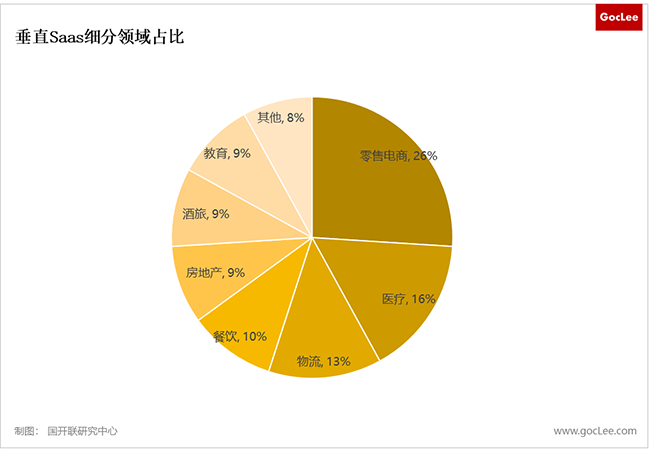 在業(yè)務(wù)垂直型SaaS領(lǐng)域,市場規(guī)模較大的賽道分別為CRM、客服與呼叫中心、ERP、通信(郵箱、會議和直播),規(guī)模占比為20%、15%、11%與11%。從融資情況看,HRM、CRM、財(cái)稅管理、運(yùn)維與安全等賽道排名靠前。在行業(yè)垂直型SaaS領(lǐng)域,市場規(guī)模較大的賽道分別為零售電商、醫(yī)療、物流、餐飲,規(guī)模占比分別為26%、16%、13%與10%,其次房地產(chǎn)、酒旅、教育均在9%左右,從融資情況看,醫(yī)療、教育、物流、餐飲、金融等熱度較高。