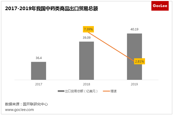 據(jù)中國海關(guān)總署數(shù)據(jù)顯示,2017-2019 年,我國中藥類商品出口貿(mào)易總額從 36.40 億美元增長到 40.19 億美元,區(qū)間增幅10.41%,保持穩(wěn)定增長態(tài)勢。