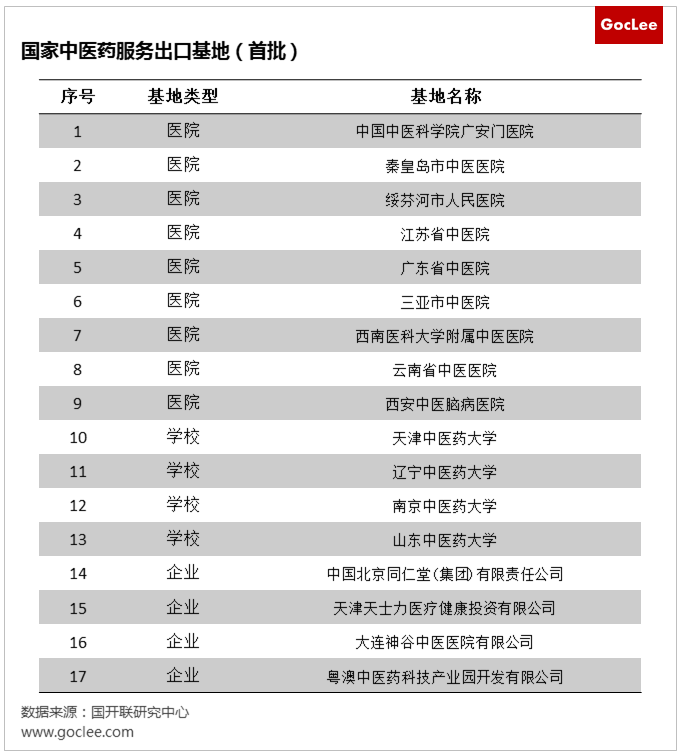 2019年4月,商務(wù)部辦公廳、國家中醫(yī)藥管理局辦公室發(fā)布《關(guān)于開展中醫(yī)藥服務(wù)出口基地建設(shè)工作的通知》, 中醫(yī)藥服務(wù)出口基地是以中醫(yī)藥相關(guān)醫(yī)療保健、教育培訓(xùn)、科研、產(chǎn)業(yè)和文化等領(lǐng)域服務(wù)出口為特色的中醫(yī)藥企事業(yè)機構(gòu)。建設(shè)一批以出口為導(dǎo)向,具有較強輻射帶動作用的基地對于促進中醫(yī)藥服務(wù)貿(mào)易創(chuàng)新發(fā)展,優(yōu)化我國服務(wù)貿(mào)易結(jié)構(gòu),打造“中國服務(wù)”國家品牌,提升中華文化軟實力,構(gòu)建人類命運共同體具有重要意義。