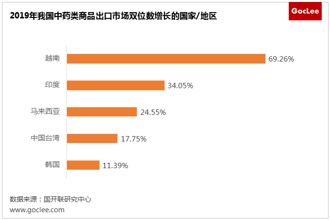 2019 年,我國中藥類商品出口市場排名前十的國家/地區(qū)中,對其中 5 個國家/地區(qū)的出口金額呈現(xiàn)了雙位數(shù)增長。排名前三的國家分別是越南、印度和馬來西亞,我國對其出口中藥商品金額的增幅分別為 69.26%、34.05%和 24.55%,均為新興市場國家。