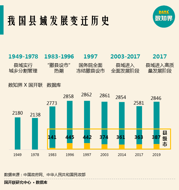建國后,我國縣級行政區(qū)的發(fā)展也貫穿著新中國70年的歷史進(jìn)程,對我國城鄉(xiāng)發(fā)展產(chǎn)生了深遠(yuǎn)的影響。我國縣域的發(fā)展走過了城鄉(xiāng)二元分割的制度體系、以經(jīng)濟(jì)為中心快速發(fā)展,逐步轉(zhuǎn)向了全面、高質(zhì)量的發(fā)展階段。