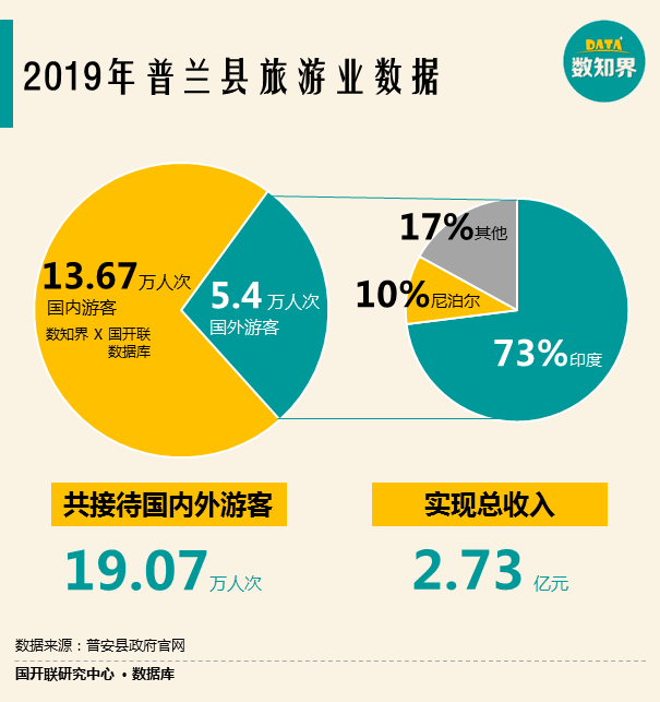 獨(dú)特的宗教意義和民俗文化也為普蘭帶來了大量的海內(nèi)外游客、教徒。也因此,旅游業(yè)成為了普蘭的支柱產(chǎn)業(yè)之一。2019年,普蘭縣共接待國內(nèi)外游客19.07萬人次,其中國內(nèi)游客13.67萬人次,國外游客5.4萬人次,實(shí)現(xiàn)總收入2.73億元。從客源地來講,國外游客中印度人占73%,尼泊爾人占10%。