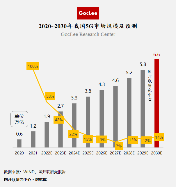 隨著我國5G基礎(chǔ)設(shè)施建設(shè)全面鋪開以及5G商用進(jìn)程的不斷加快,產(chǎn)業(yè)規(guī)模將日益擴(kuò)大。根據(jù)國開聯(lián)研究中心報告顯示,預(yù)計到2030年,我國5G市場規(guī)模將達(dá)到6.6萬億元。
