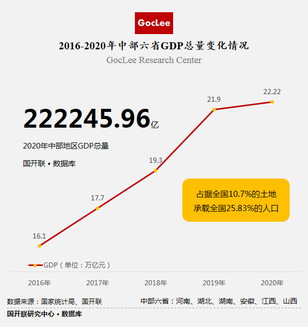 中部地區(qū)包含河南、湖北、湖南、安徽、江西和山西六個相鄰省份。占據(jù)全國10.7%的土地,承載了全國25.83%的人口,2020年,受疫情影響,中部地區(qū)GDP增速放緩但仍實現(xiàn)增長,2020年GDP為22.22萬億元,是全國經(jīng)濟(jì)增速最快的區(qū)域之一。