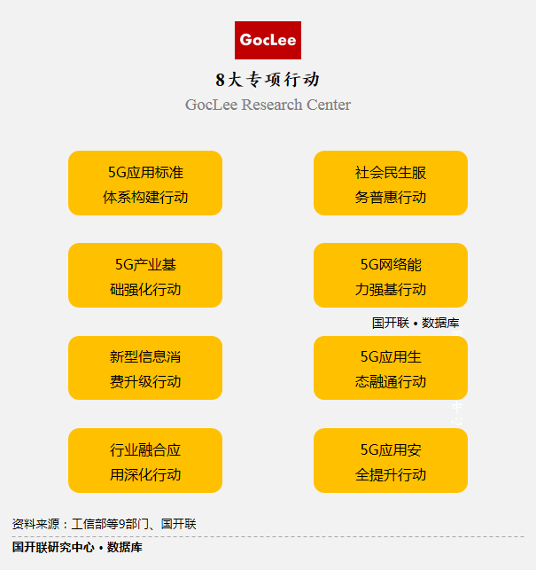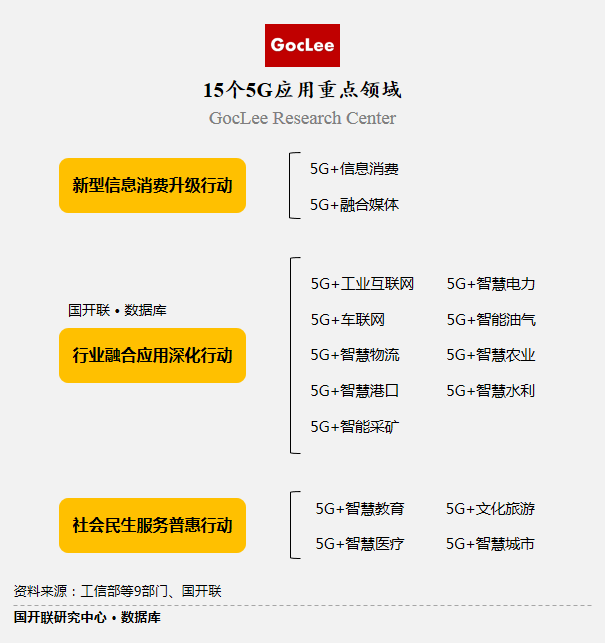 《行動計劃》面向信息消費、實體經(jīng)濟、民生服務三大領域,重點推進15個行業(yè)的5G應用。從促進信息消費看,重點培育5G+新型信息消費和融合媒體,拉動新型產(chǎn)品和新型內(nèi)容消費,加快5G在媒體領域的落地應用;從推動實體經(jīng)濟域看,重點推進5G在工業(yè)互聯(lián)網(wǎng)、車聯(lián)網(wǎng)、智慧物流、智慧港口、智慧采礦、智慧電力、智慧油氣、智慧農(nóng)業(yè)和智慧水利等領域的深度應用,加快重點行業(yè)數(shù)字化轉(zhuǎn)型進程。從提升民生服務領域看,重點加大在智慧教育、智慧醫(yī)療、智慧文旅和智慧城市的5G應用創(chuàng)新,探索新模式新業(yè)態(tài)。
