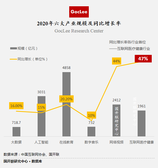 2020年,我國云計算整體市場規(guī)模達到1781.8億元,增速為33.6%,市場規(guī)模增速明顯;智能網(wǎng)聯(lián)汽車銷量為303.2萬輛,同比增長107%,滲透率保持在15%左右;網(wǎng)絡視頻市場規(guī)模達到2412億元,同比增長44%,數(shù)字音樂產(chǎn)業(yè)市場規(guī)模達732億元,同比增長10%;在線教育市場規(guī)模繼續(xù)保持穩(wěn)定增長,達到4858億元,同比增長20.2%;互聯(lián)網(wǎng)醫(yī)療市場增速迅猛,規(guī)模達到1961億元,同比增長47%,增幅位居各行業(yè)首位。