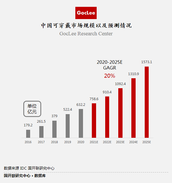 國開聯研究中心認為,預計到2025年中國智能可穿戴設備市場規(guī)模將達1573.1億元,復合增長率高達20.0%,個中投資機會肯定不容小覷。