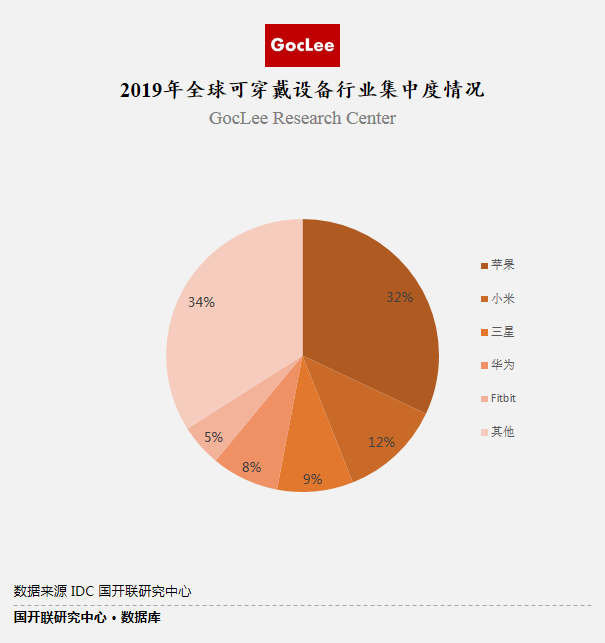放眼全球市場,目前競爭格局十分穩(wěn)固,其中蘋果多年位居第一,2019整年,蘋果公司穿戴設備出貨占了全球可穿戴市場出貨量的32%,其后二梯隊有小米、三星、華為這三家大廠,三者對應份額12%、9%、8%。