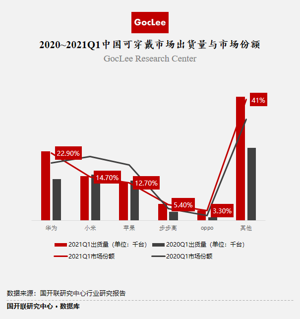 今年Q1,國內市場前五大穿戴設備分別是華為、小米、蘋果、步步高和oppo。其中華為和小米的表現相當耀眼,出貨量分別達到6253千臺和4004千臺,其中華為的市場占有率出現一定的上調,反而是小米的市場空間出現一定程度的下滑。