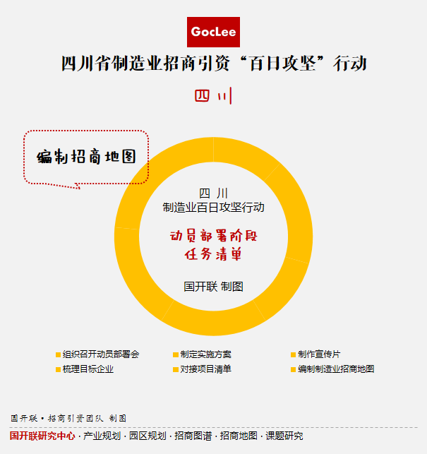 2021年9月,以市(州)為主體的四川省制造業(yè)招商引資“百日攻堅”行動正式啟動,對四川省制造業(yè)招商引資工作作出戰(zhàn)略部署。在“動員部署階段”提出了“六大行動任務(wù)”,其中“編制制造業(yè)招商地圖”被作為助力招商的任務(wù)之一進行部署。