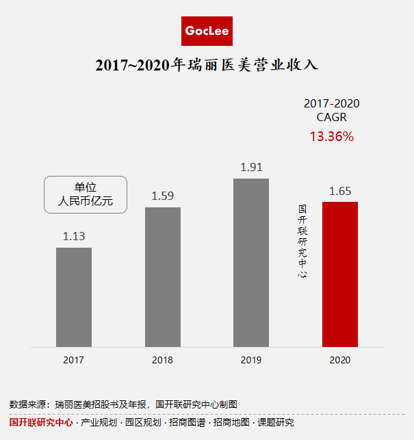 在這樣的地域背景下,一些醫(yī)美機構(gòu)深耕經(jīng)濟實力強、消費水平高的小城市市場,將連鎖經(jīng)營重心下沉,配套符合當(dāng)?shù)匦枨蟮尼t(yī)美項目,已在當(dāng)?shù)貥?gòu)筑起品牌優(yōu)勢,典型案例有2020年赴港上市的瑞麗醫(yī)美。瑞麗醫(yī)美深耕浙江市場,截至2019年末在浙江省內(nèi)約850名醫(yī)療美容服務(wù)提供商排名第5,是浙江省內(nèi)代表性醫(yī)美連鎖品牌之一。招股書及財報數(shù)據(jù)顯示2017年~2020年公司總營收從1.13億元增至1.65億元,年復(fù)合增速達到13.36%。