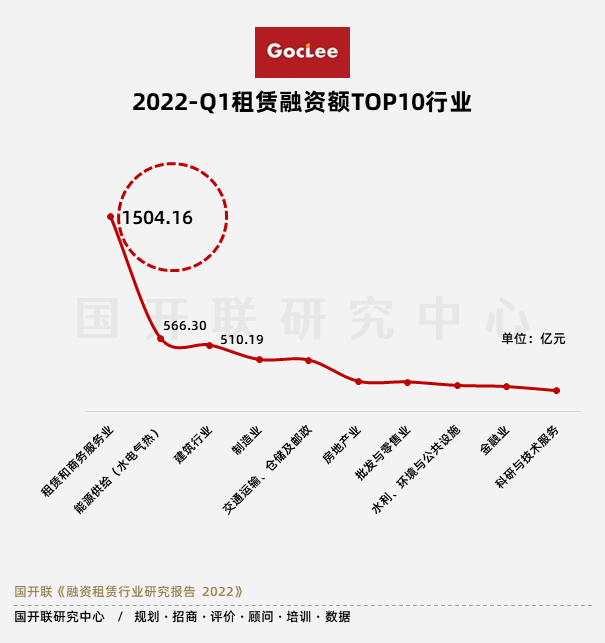 國開聯(lián)《融資租賃行業(yè)研究報告2022》指出,2022年一季度租賃融資額最多的三個行業(yè)分別是租賃和商務(wù)服務(wù)業(yè)、電力、熱力、燃?xì)饧八a(chǎn)和供應(yīng)業(yè)和建筑業(yè)。其中,租賃和商務(wù)服務(wù)業(yè)排名第一位,融資額為1504.16億元;電力、熱力、燃?xì)饧八a(chǎn)和供應(yīng)業(yè)排名第二位,融資額為566.30億元;建筑業(yè)排名第三位,融資額為510.19億元。