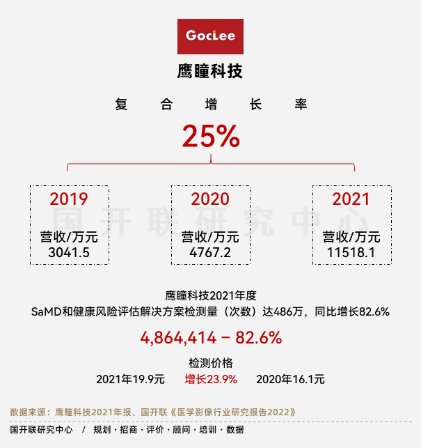 鷹瞳科技,是一家人工智能輔助慢性病管理解決方案提供商,致力于提供人工智能視網(wǎng)膜影像識(shí)別的早期檢測(cè)、輔助診斷及健康風(fēng)險(xiǎn)評(píng)估解決方案。鷹瞳科技,2019-2021年?duì)I收復(fù)合增長(zhǎng)率高達(dá)25%。
