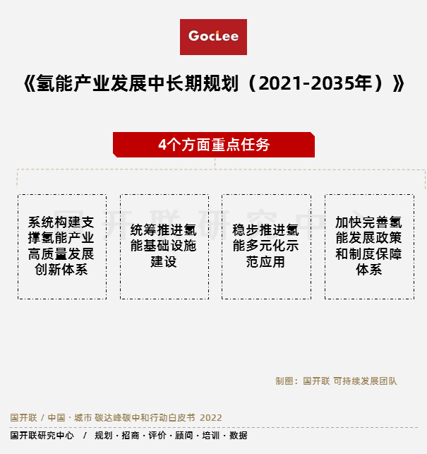 2022年3月23日,我國首個(gè)氫能產(chǎn)業(yè)中長期規(guī)劃出臺(tái),《氫能產(chǎn)業(yè)發(fā)展中長期規(guī)劃(2021-2035年)》,明確了氫能戰(zhàn)略定位、規(guī)劃了氫能產(chǎn)業(yè)發(fā)展各階段目標(biāo)、以及4個(gè)方面重點(diǎn)任務(wù),對(duì)國際和國內(nèi)氫能發(fā)展現(xiàn)狀和形勢做了總結(jié)和梳理。其中,規(guī)劃了氫能產(chǎn)業(yè)發(fā)展各階段目標(biāo)為,