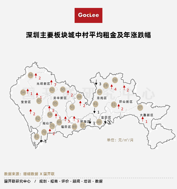深圳住房租賃市場(chǎng)主要部分在城中村,占比70%。從大部分意義上,城中村租金能代表深圳租賃住房的平均水準(zhǔn)。制定深圳租金地圖,可看到主要板塊租金差異,進(jìn)一步分析差異原因: