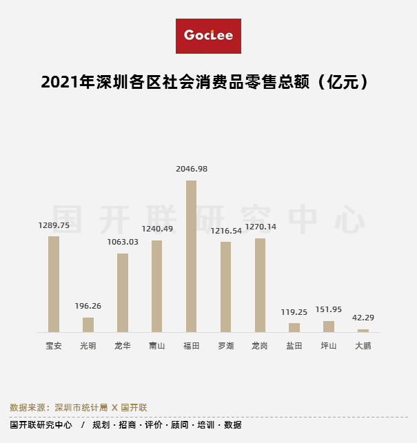 從社會(huì)消費(fèi)品零售總額來(lái)看,福田區(qū)居民消費(fèi)能力位居榜首,幾乎占全市1/4,而收入水平高的南山其消費(fèi)力不強(qiáng)。