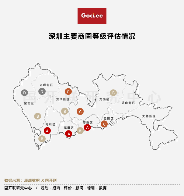 以深圳城市來(lái)看,福田、南山、羅湖等商圈,主要為A、B類等級(jí),深圳北、龍崗中心城等基礎(chǔ)配套較新的商圈歸為B類,觀瀾、布吉、沙頭角離中心區(qū)較遠(yuǎn),商業(yè)配套較為老舊,歸為C類,光明、沙井即為D類。