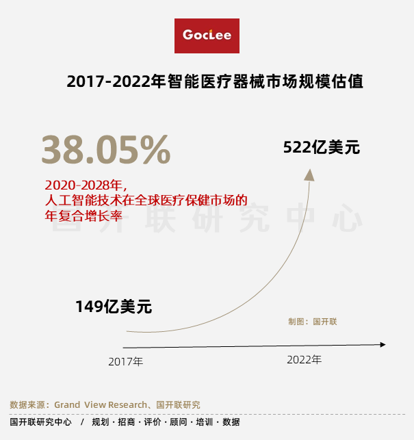 據(jù)相關(guān)數(shù)據(jù)統(tǒng)計(jì),2017到2022年間,以醫(yī)療物聯(lián)網(wǎng)為基礎(chǔ)的智慧醫(yī)療器械市場估值從149億美元增加到522億美元。2022年-2028年,人工智能技術(shù)在全球醫(yī)療保健市場的年復(fù)合增長率或?qū)⑦_(dá)到38.05%。