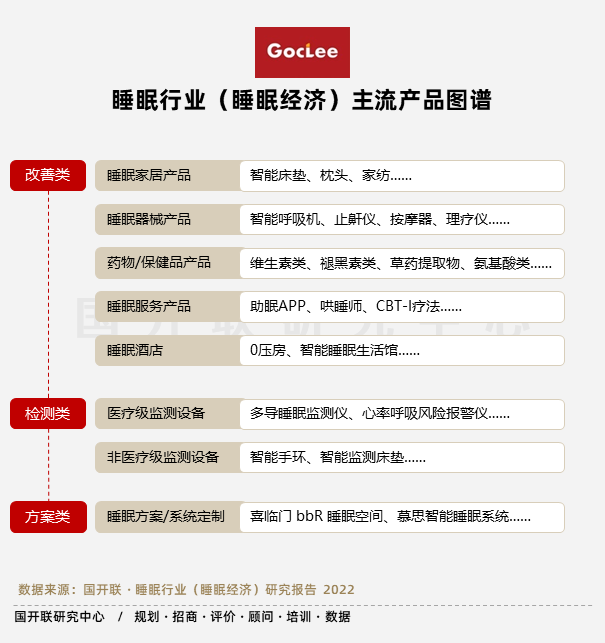 從睡眠行業(yè)產(chǎn)品細分來看,主要分成改善睡眠產(chǎn)品、監(jiān)測睡眠產(chǎn)品以及助眠方案/系統(tǒng)定制。第一,改善類睡眠產(chǎn)品主要分為五種,一是睡眠家居產(chǎn)品,包括智能床墊、枕頭、家紡等;二是睡眠器械產(chǎn)品,包括智能呼吸機、止鼾儀、按摩器、理療儀等;三是藥物/保健產(chǎn)品,包括維生素類、褪黑素類、草藥提取物、氨基酸類助眠保健品等;四是睡眠服務(wù)產(chǎn)品,包括助眠APP、哄睡師、CBT-I療法等;五是睡眠酒店類,如0壓房、智能睡眠生活館等。第二,監(jiān)測睡眠產(chǎn)品主要分為醫(yī)療級監(jiān)測設(shè)備,包括多導(dǎo)睡眠監(jiān)測儀、心率呼吸風(fēng)險報警儀、睡眠呼吸初篩儀等,以及非醫(yī)療級監(jiān)測設(shè)備,如智能手環(huán)、智能檢測床墊等。第三,睡眠方案系統(tǒng)打造,如喜臨門bbR睡眠空間、慕思智能睡眠系統(tǒng)等。
