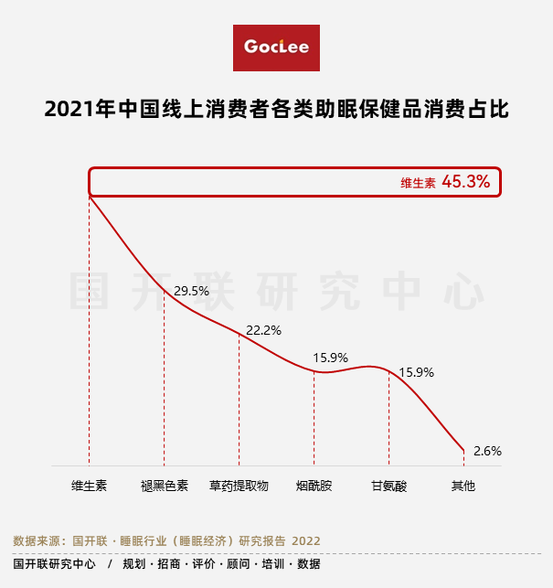 據(jù)國開聯(lián)《睡眠行業(yè)研究報告》數(shù)據(jù)顯示,2021年中國45.3%購買了維生素類助眠保健品,29.5%網(wǎng)民購買了褪黑素助眠保健品,其次為草藥提取物和氨基酸類成分。從助眠成分來看,主要為中藥材植物原料(酸棗仁、靈芝、五味子、茯苓),氨基酸類(甘氨酸、精氨酸、絲氨酸、色氨酸等),新食品原料(茶葉茶氨酸、GABA),激素類(褪黑素)以及牛奶蛋白(乳清蛋白、乳鐵蛋白、酪蛋白水解肽)。