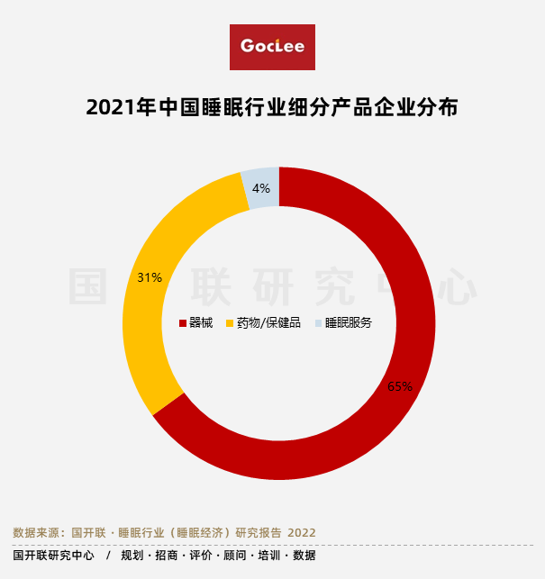 據(jù)國開聯(lián)研究中心的不完全統(tǒng)計,中國睡眠產(chǎn)業(yè)企業(yè)數(shù)量為2000家。其中器械占比最高為65%,其次為藥物/保健品為31%,睡眠服務(wù)為4%。