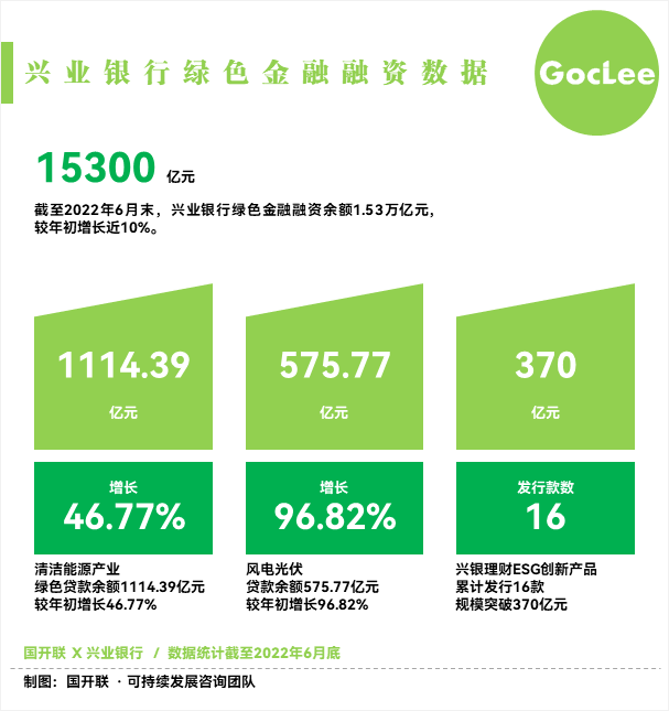 截至2022年6月末,興業(yè)銀行綠色金融融資余額1.53萬億元,較年初增長近10%;清潔能源產(chǎn)業(yè)綠色貸款余額1114.39億元,較年初增長46.77%;風(fēng)電光伏貸款余額575.77億元,較年初增長96.82%;興銀理財(cái)ESG創(chuàng)新產(chǎn)品累計(jì)發(fā)行16款,規(guī)模突破370億元。