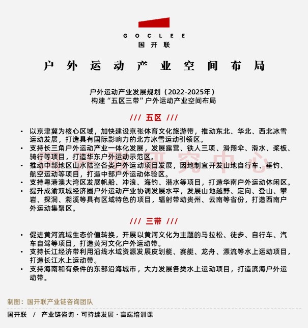 一是針對(duì)“全國戶外運(yùn)動(dòng)產(chǎn)業(yè)發(fā)展格局”方面,明確了“構(gòu)建“五區(qū)三帶”戶外運(yùn)動(dòng)產(chǎn)業(yè)空間布局”的計(jì)劃;